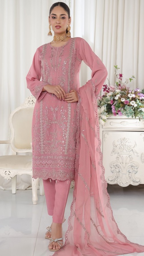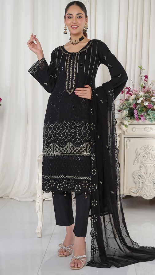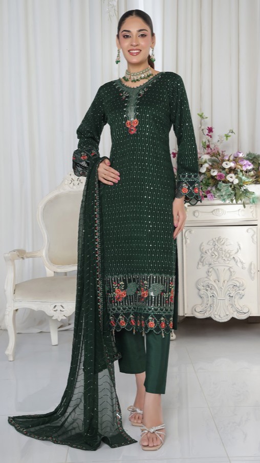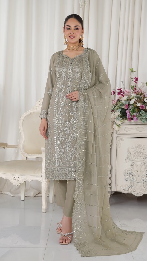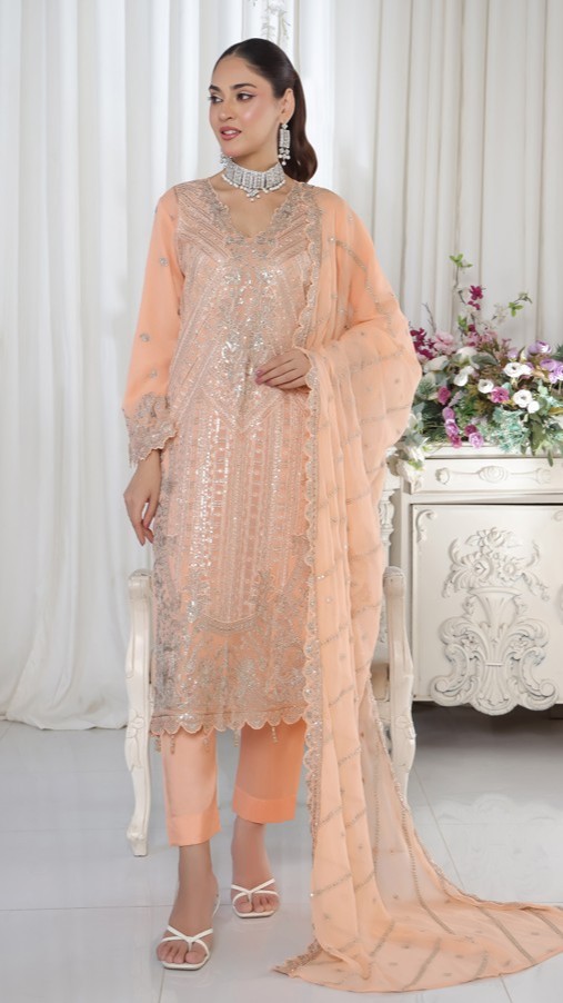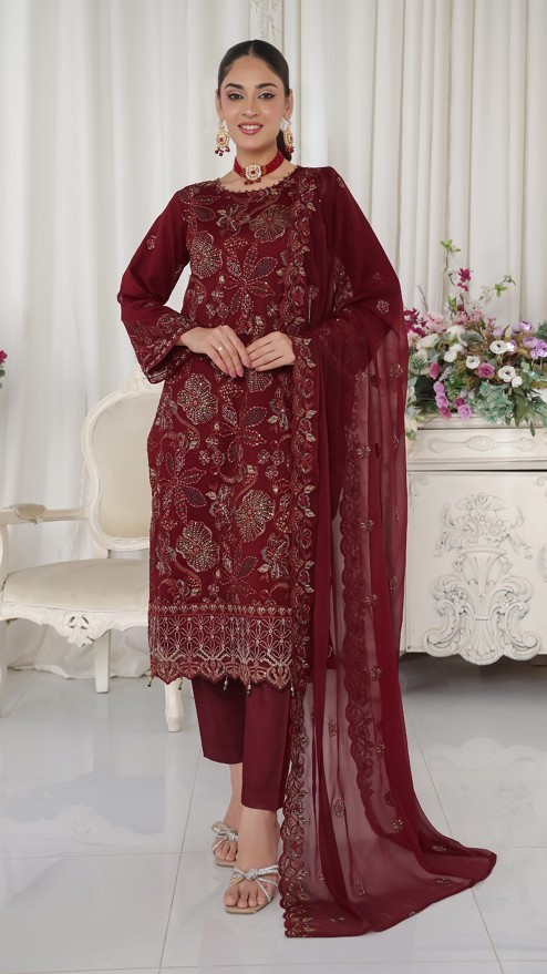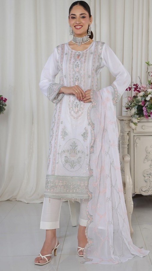FABRIC: Dress: Pure Chiffon with Zircon & Karchupi work. Dupatta: Pure Chiffon. Inner: Pure Linen. & Bottom: Pure Linen